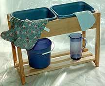 Washing cloths is a high interest activity for children. Accessories include 2 basins, cloth apron, scrub board, bucket, pitcher, and 2 drying clothes for clean up after exercise. All accessories are white. The stand comes in two sizes: Primary (for ages 3-7) and Toddler.